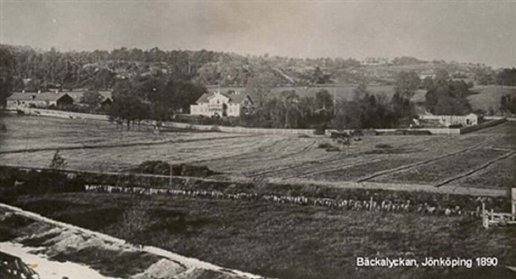 På väster i Jönköping finns ett område som kallas Bäckalyckan och även en gata som heter Bäckalyckevägen. Båda dessa begrepp kommer naturligtvis från gården Bäckalyckan, som ses mitt i bilden. Den gården var en av flera gårdar som låg runt staden och ofta beboddes av anställda på Hovrätten. Vid hovrättens förläggande till Jönköping uppstod en överklass som hade pengar och som ville bo ståndsmässigt. Området Bäckalyckan, som började bebyggas under slutet av 1800-talet låg utanför det egentliga stadsplanerade området. Detta slutade vid Junebäcken. Liknande områden var Torpa (något senare) och del av Rosenlund.