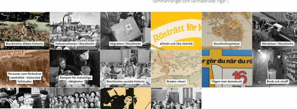 Stockholmskällan innehåller mer än 30 000 bilder, kartor, dokument och litteraturtips. Oavsett om man är från Stockholm eller inte finns det på denna sida möjlighet att ta del av skoluppgifter från förskola till gymnasium eller på annat sätt forska i Stockholms historia.