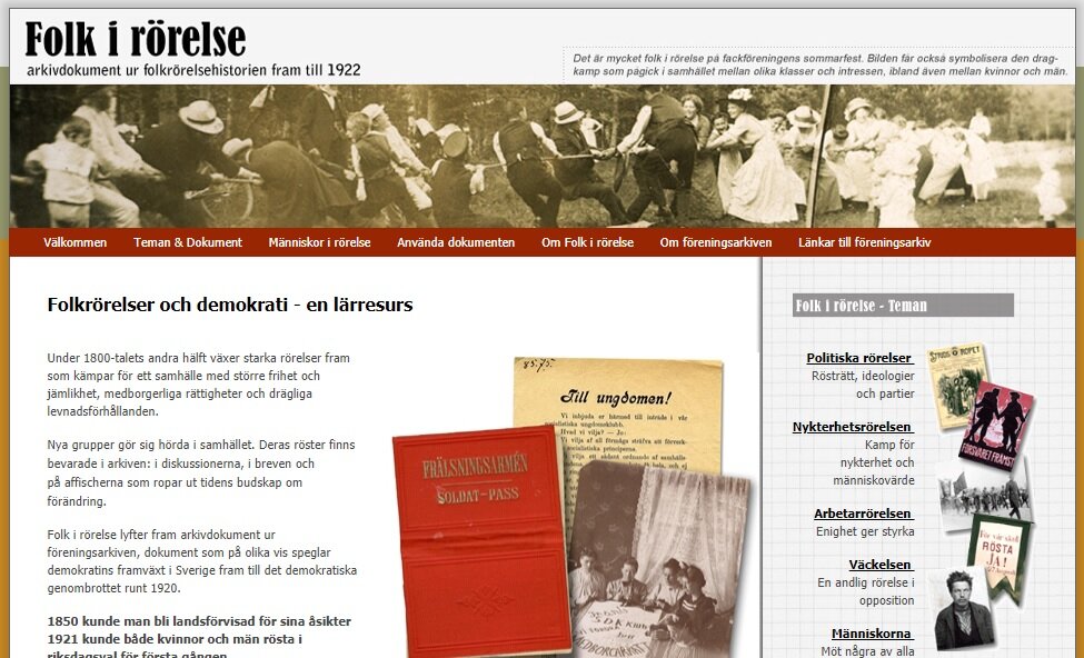 Folk i rörelse är en webbplats där man samlat arkivdokument från flera olika föreningsarkiv. Urvalet är gjort med tanke på gymnasieskolan, men är givetvis öppet att använda för såväl allmänt intresserade som studiecirklar och andra lärandemiljöer.